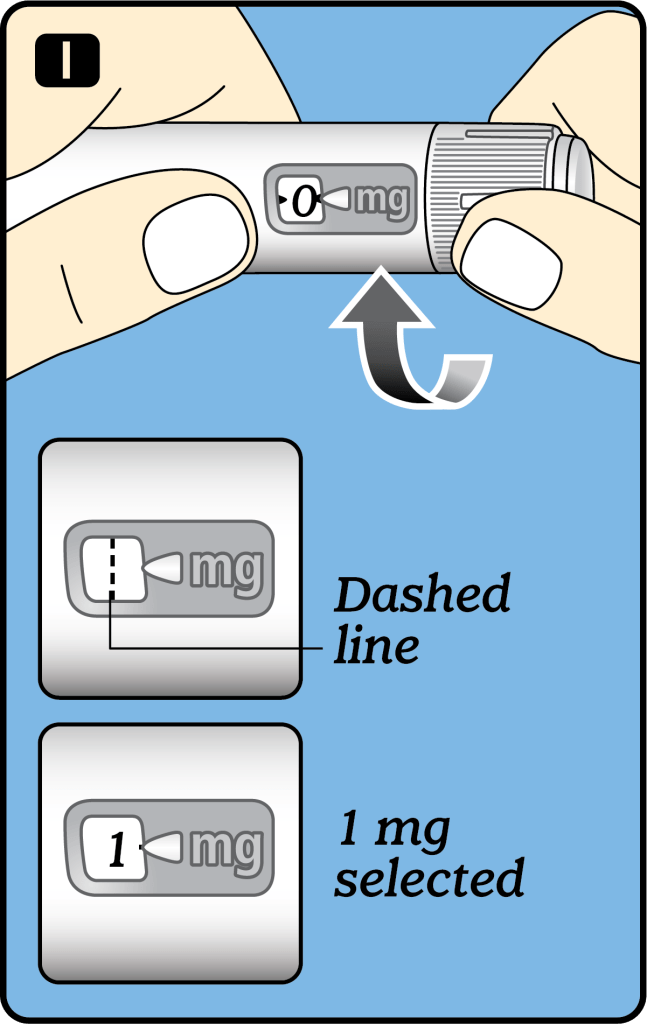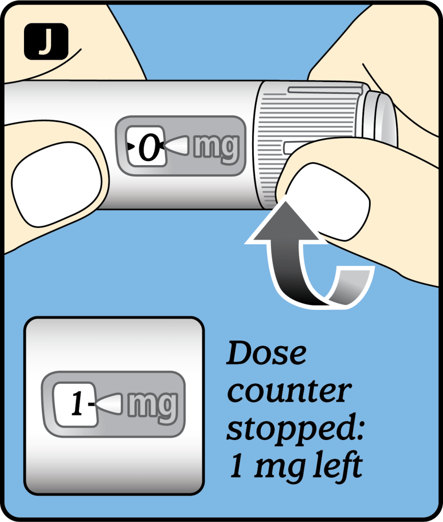 2. If it shows 1, at least 1 mg is left in your pen. If the dose counter stops before 1 mg, there is not enough VLS solution left for a full dose of 1 mg.